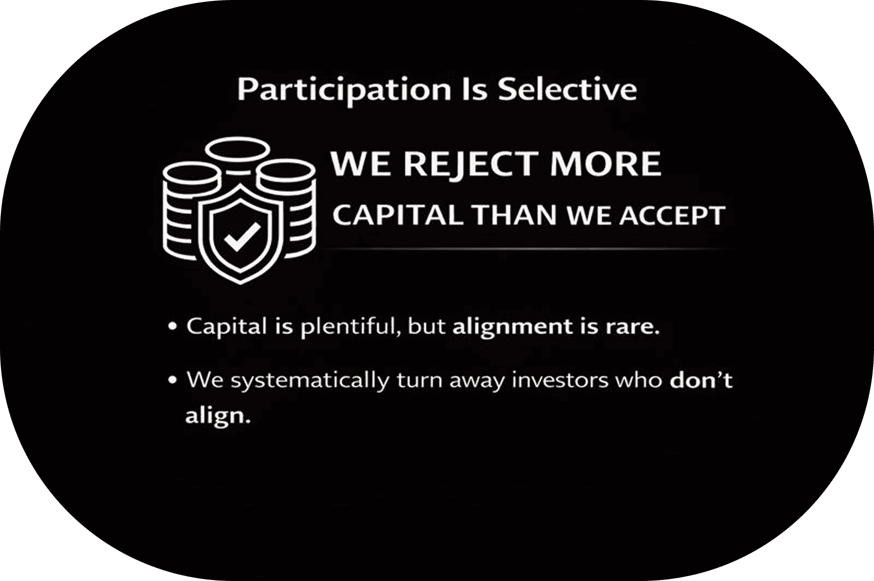 Participation is selective: We reject more capital than we accept. Alignment comes first.